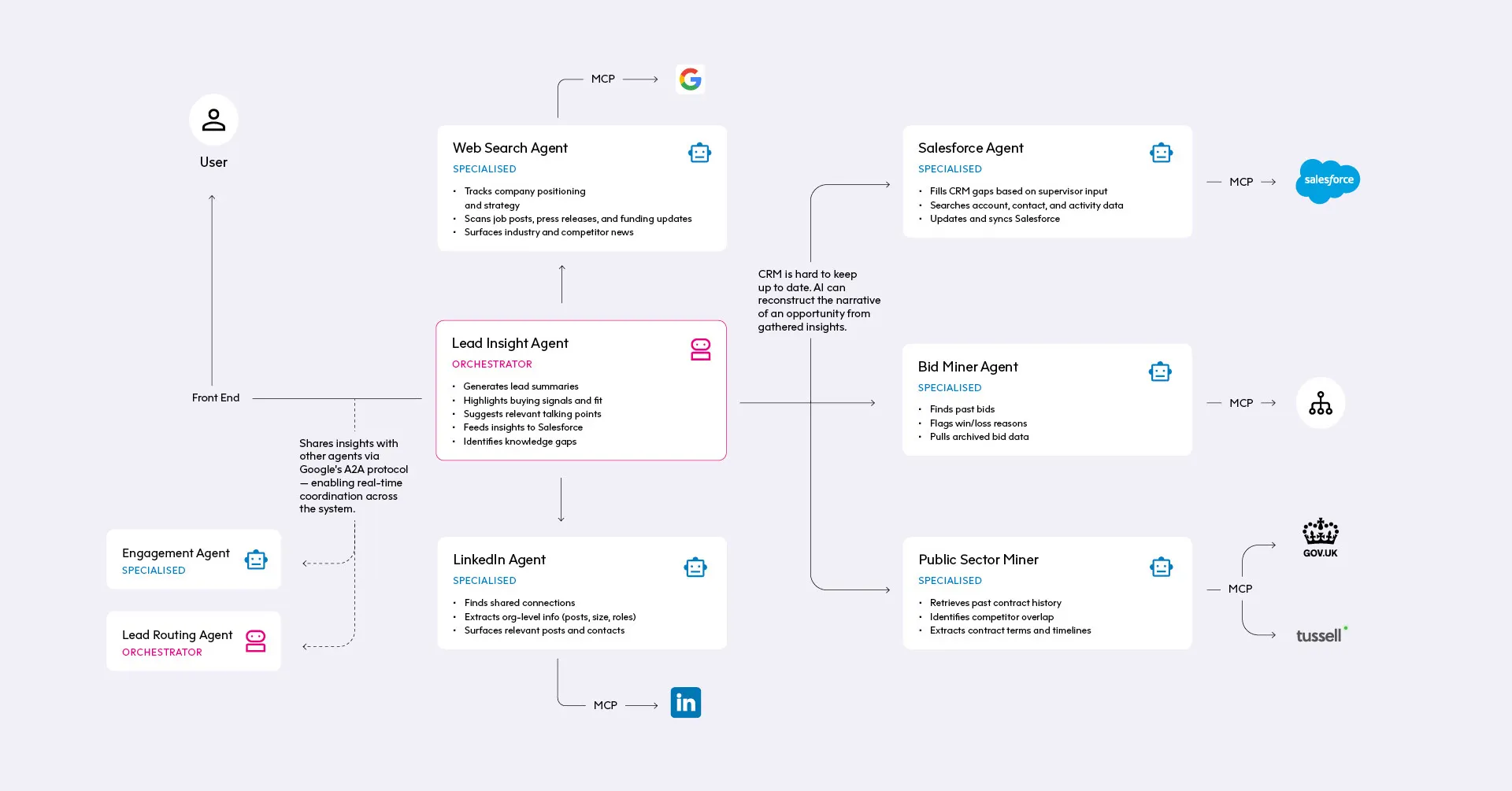 That’s why many of the multi-agent systems we’ve built for FTSE10 clients have started here. From lead qualification and bid intelligence to personalised outbound and pipeline orchestration, these agentic architectures are delivering compound returns without needing to touch core systems or regulated infrastructure. They prove value at the edge and then earn their way inward.