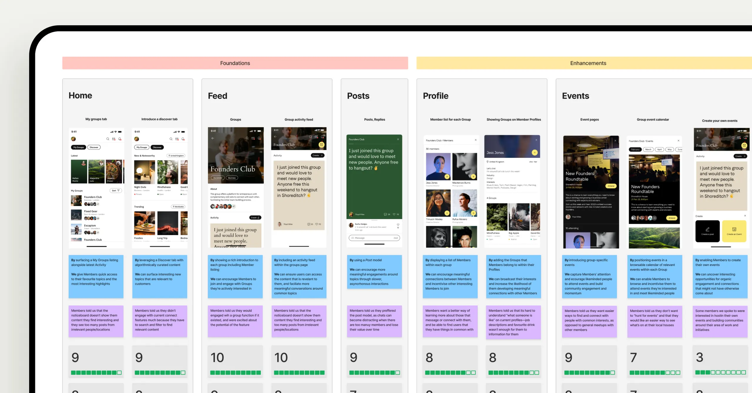 We ran three workshops with the Soho House team to understand their challenges, priorities, and objectives. We also conducted seven customer interview sessions to gather real-world user feedback from a diverse range of members. We then synthesised the insights gathered to “connect the dots” on how to improve the app.