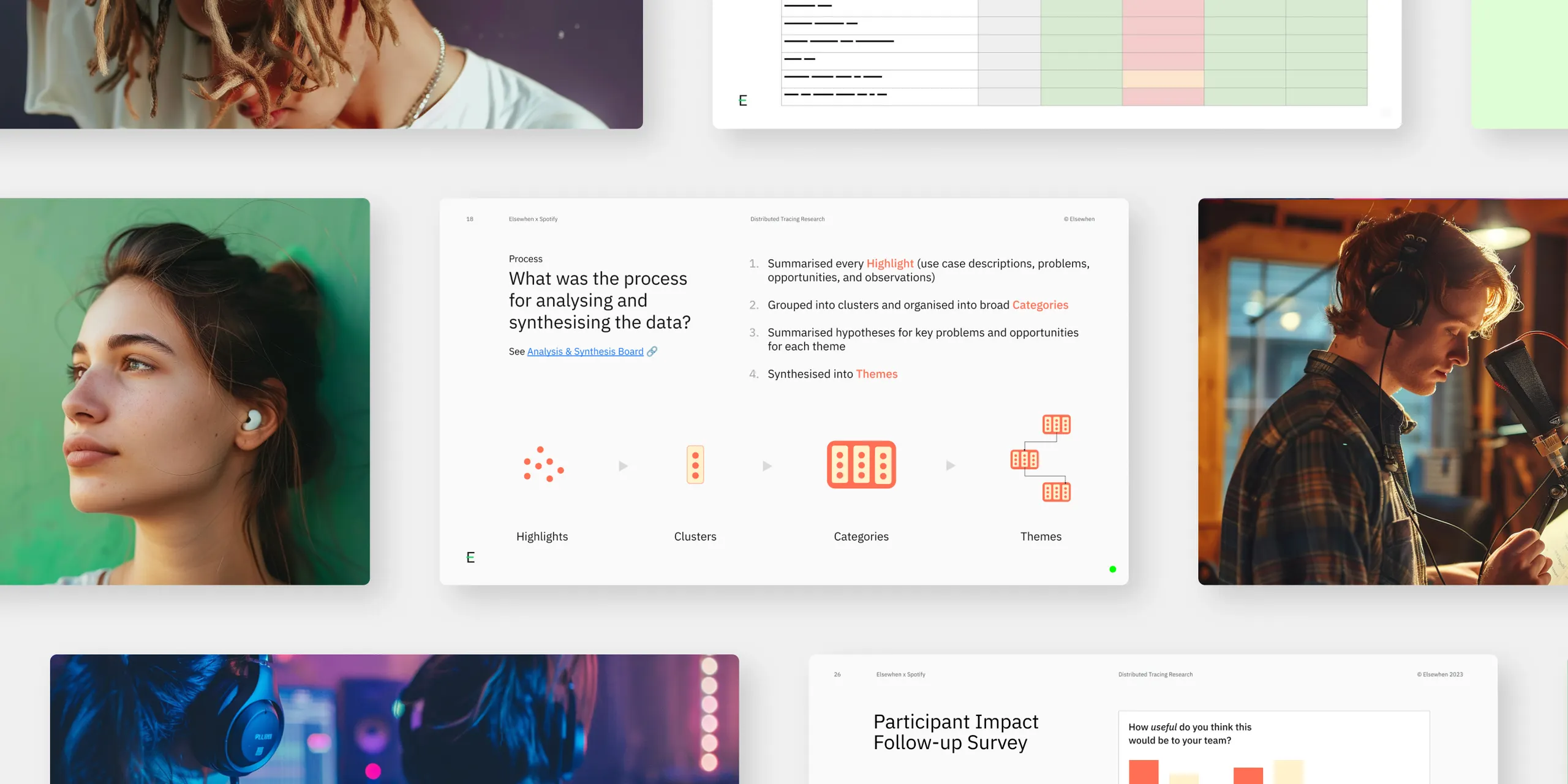 Elsewhen ran a 9 week project to research the status and value of DT at Spotify. Our team interviewed 13 back-end engineers, and also analysed data from a survey of 48 engineers. We then synthesised our findings and categorised the insights using Notion, FigJam, and other
